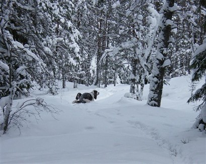 Sedan kom jag på att sätta på "kontinuerlig bildserie". Visst! Då gick det bättre, men... Rätt som det var hade kameran ändrat inställning, vilket hände lite då och då (när den buffade mot min mage i takt med mina steg). Vid ett tillfälle när Gromit rusade tjusigt över de vita snövidderna hade kameran mig ovetandes ställt in sig på "10 sekunders fördröjning". Haha! Det blev inga vackra fartfyllda Gromitbilder - däremot 15 bilder stillaliggande snö! Detta hände flera gånger. Och eftersom jag inte hade koll hur många bilder som fanns kvar på minneskortet ville jag radera dessa intetsägande "snöbilder" på en gång. Eh...? Då började "snart-är-batteriet-slut"-varningslampan att blinka. *suck*