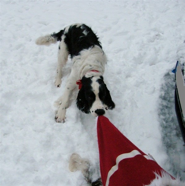 Men Tomten Spirou är bestämd. Inga hundar med snöbollar är välkomna i den fina tomtestugan. Snöbollar ska stanna utomhus!